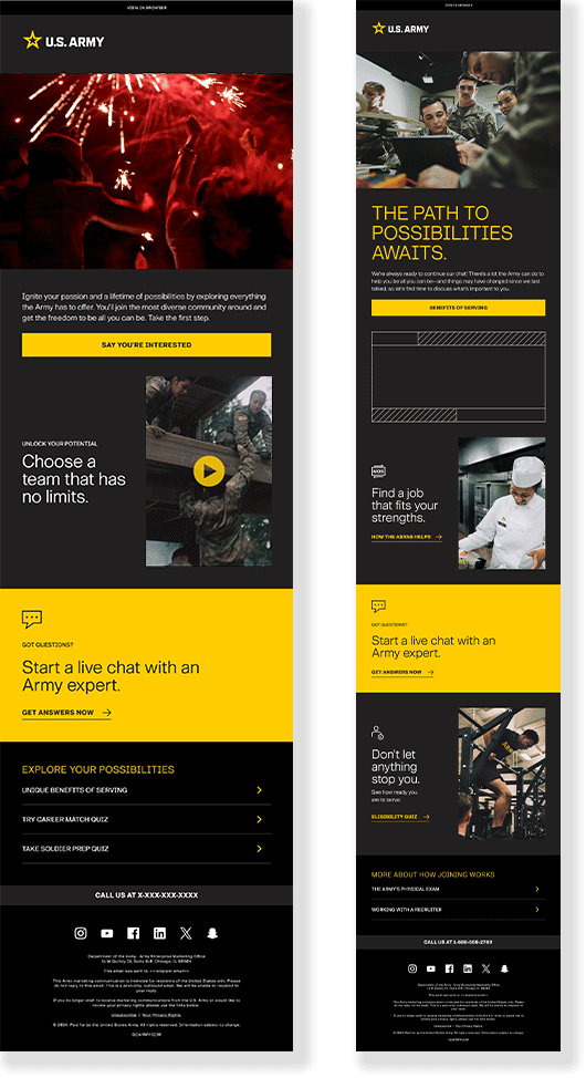 Once the designs are finalized, I collaborate closely with developers to translate Figma designs into fully functional HTML emails. This process requires careful attention to responsive design principles, ensuring that each email renders correctly across different devices and email clients. Additionally, I incorporate motion graphics into email designs where applicable, adding an extra layer of engagement to help inspire the next generation of Army recruits.