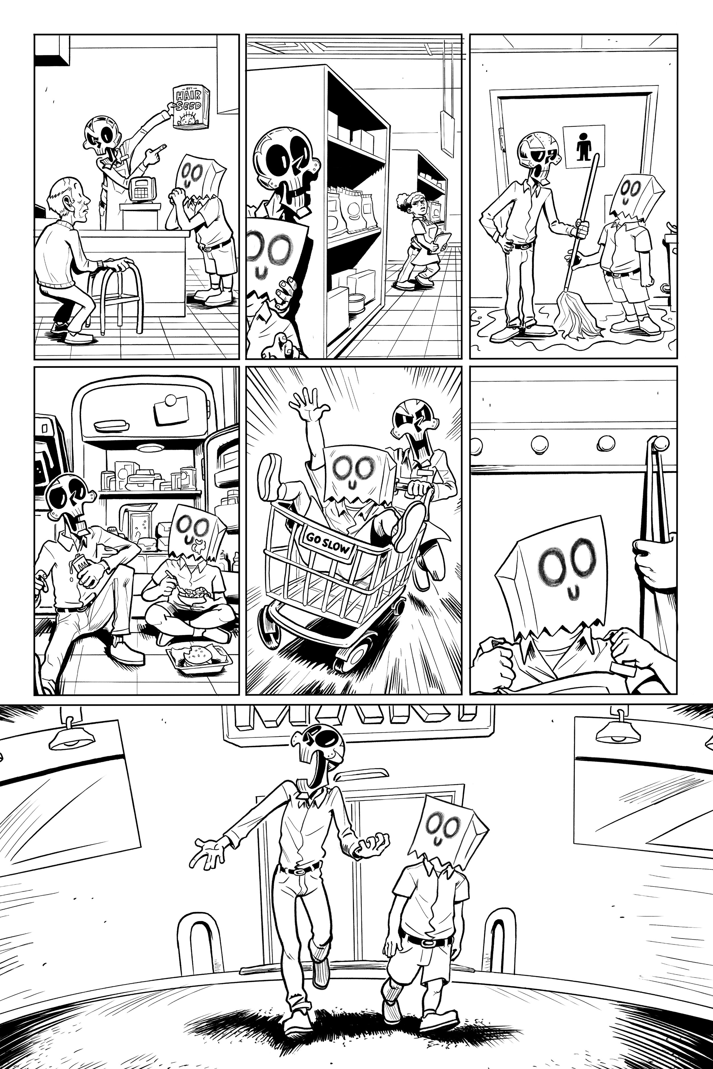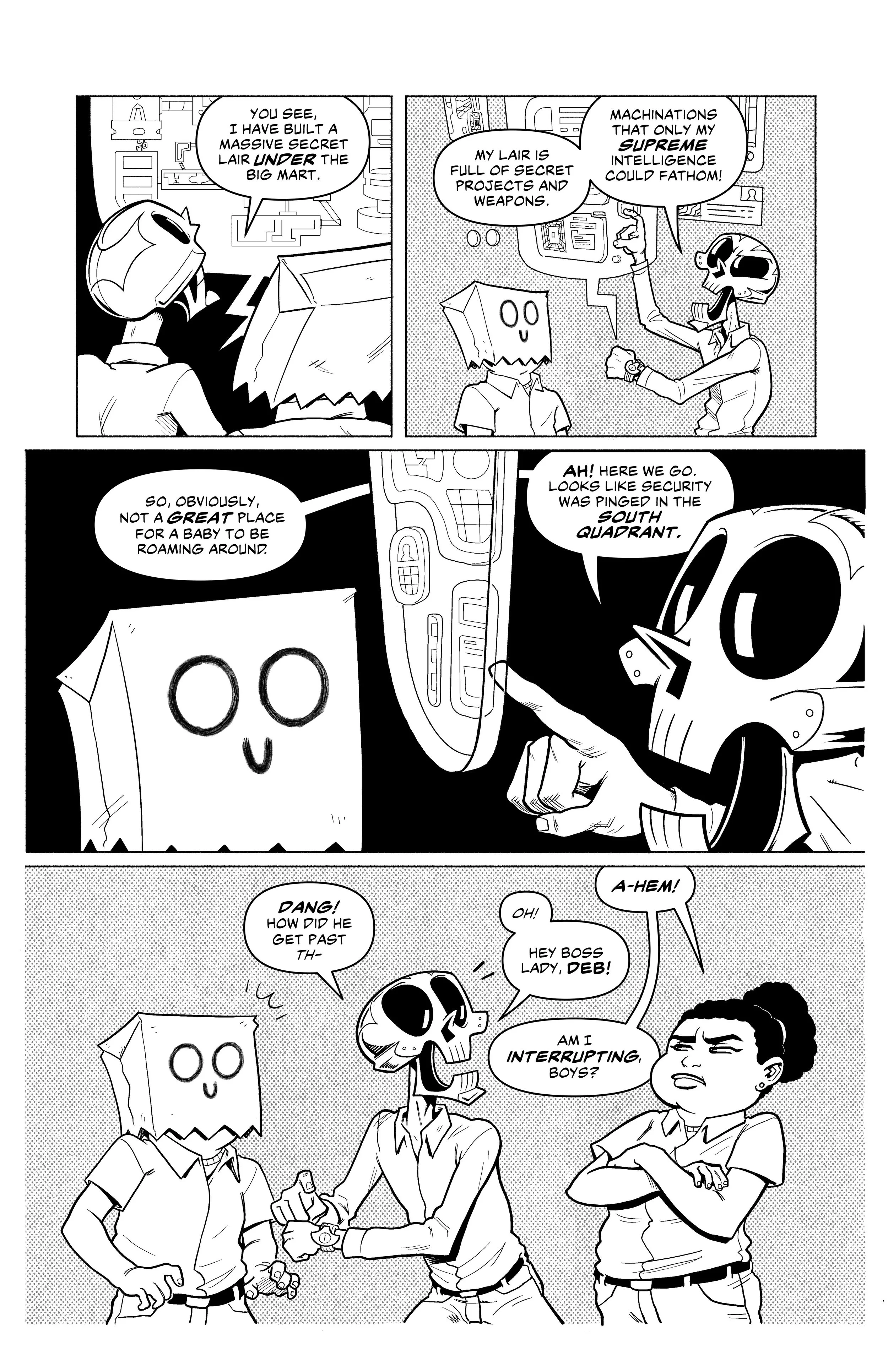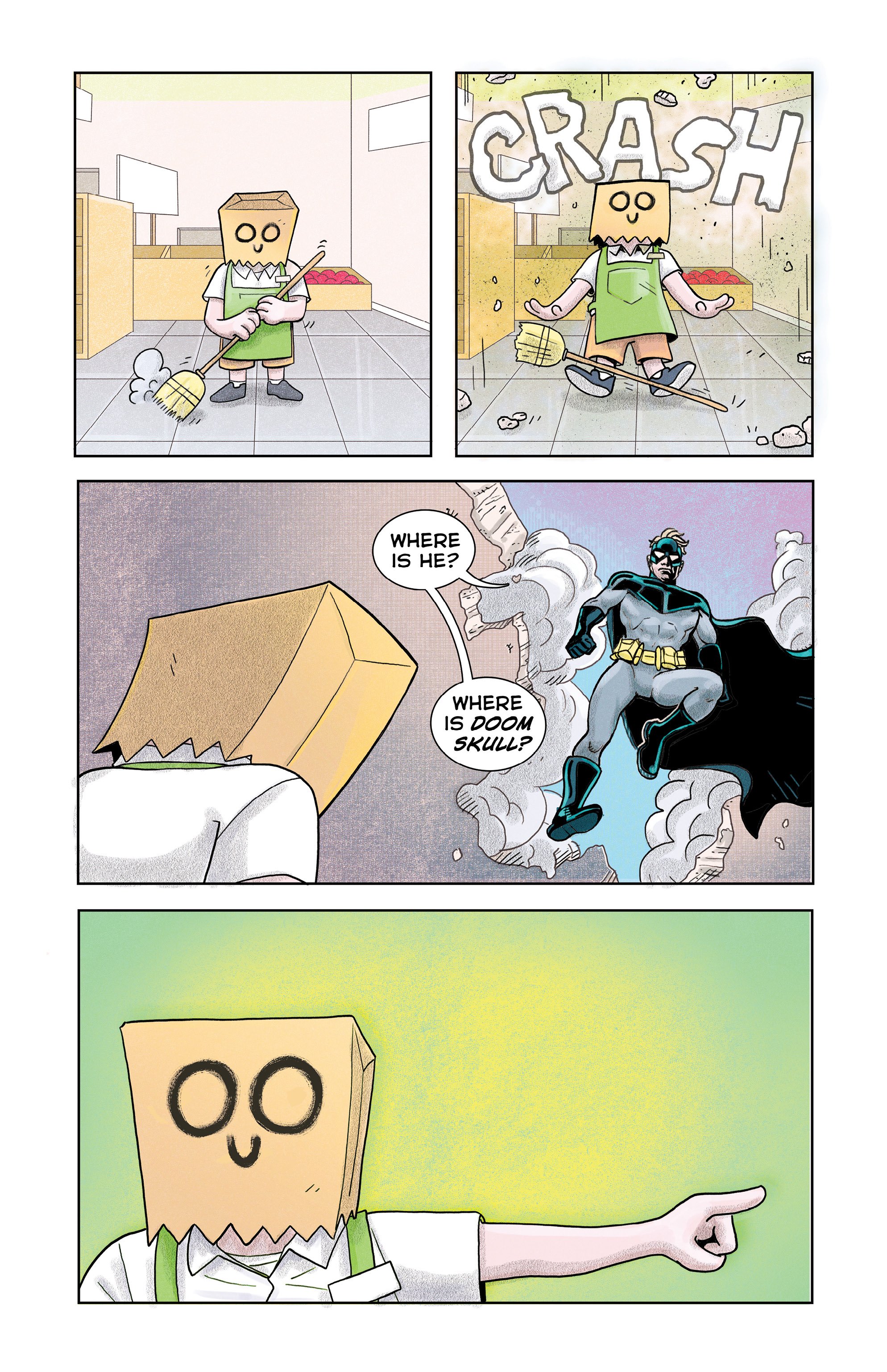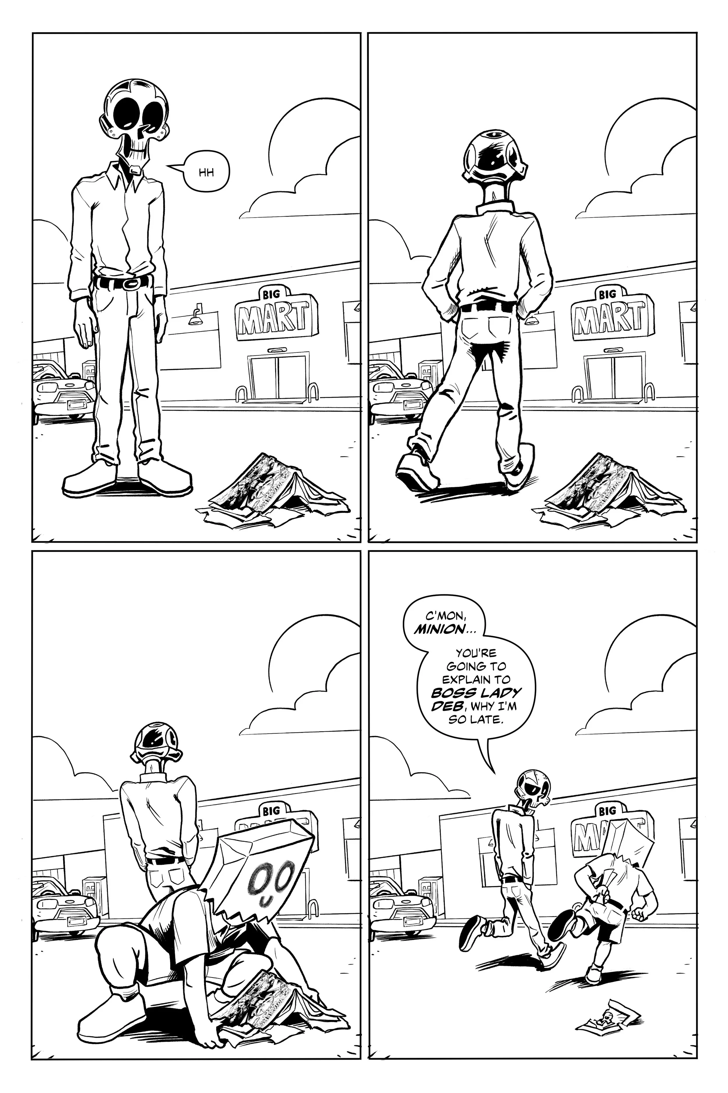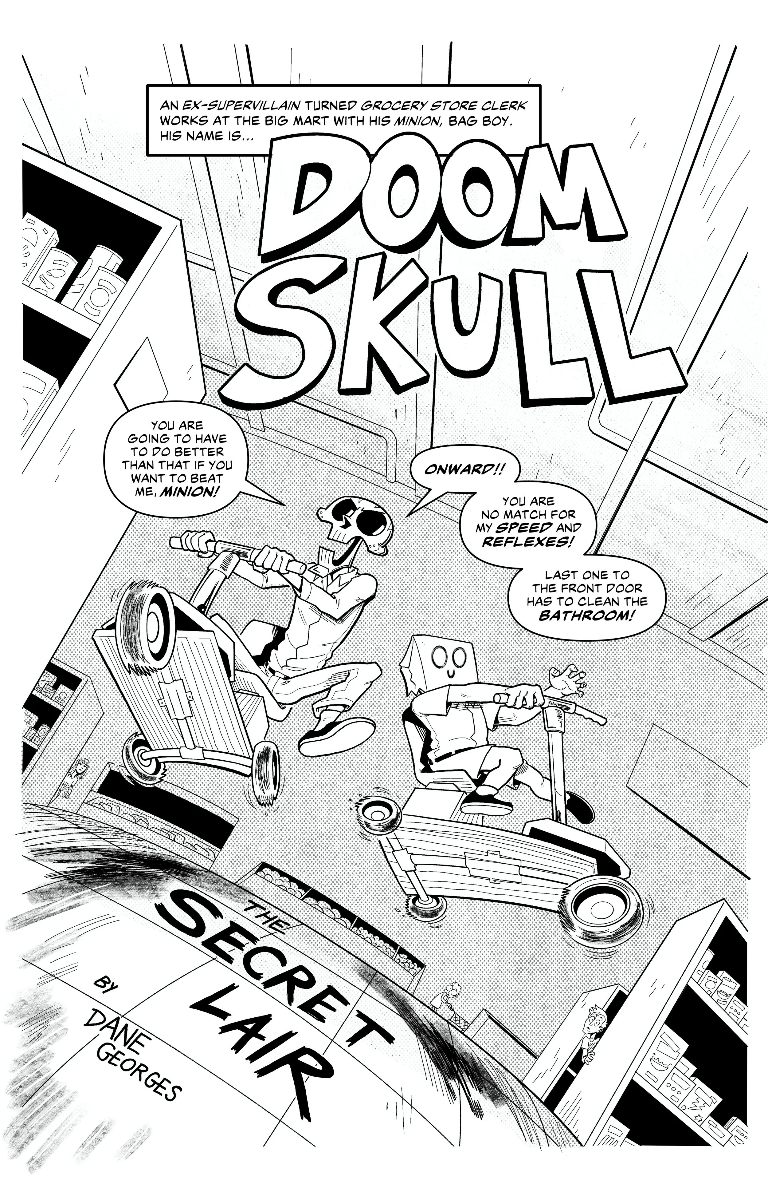 An ex-super villain named ‘Doom Skull’ begins working at the supermarket Big Mart with his minion, ‘Bag Boy’.