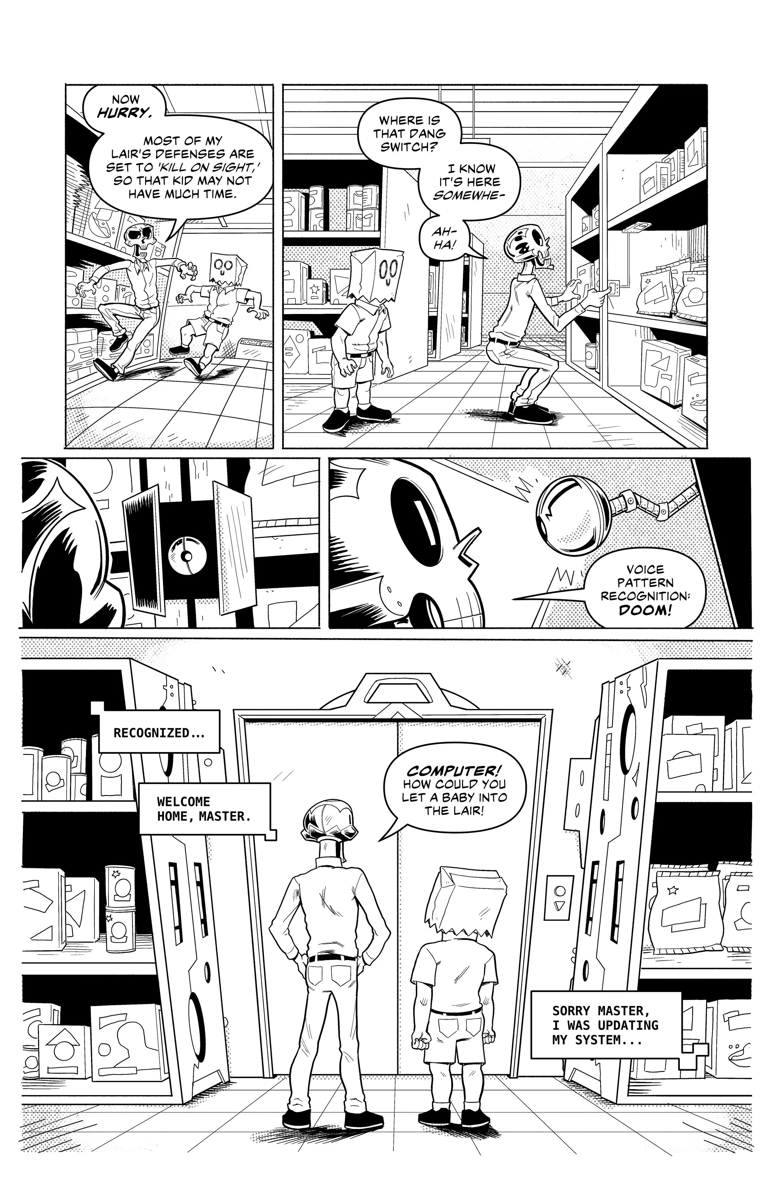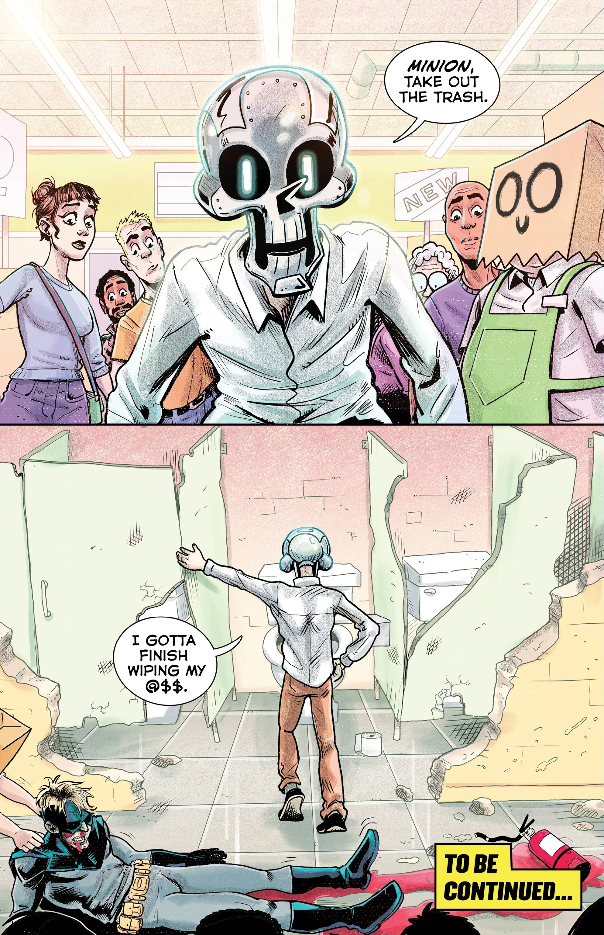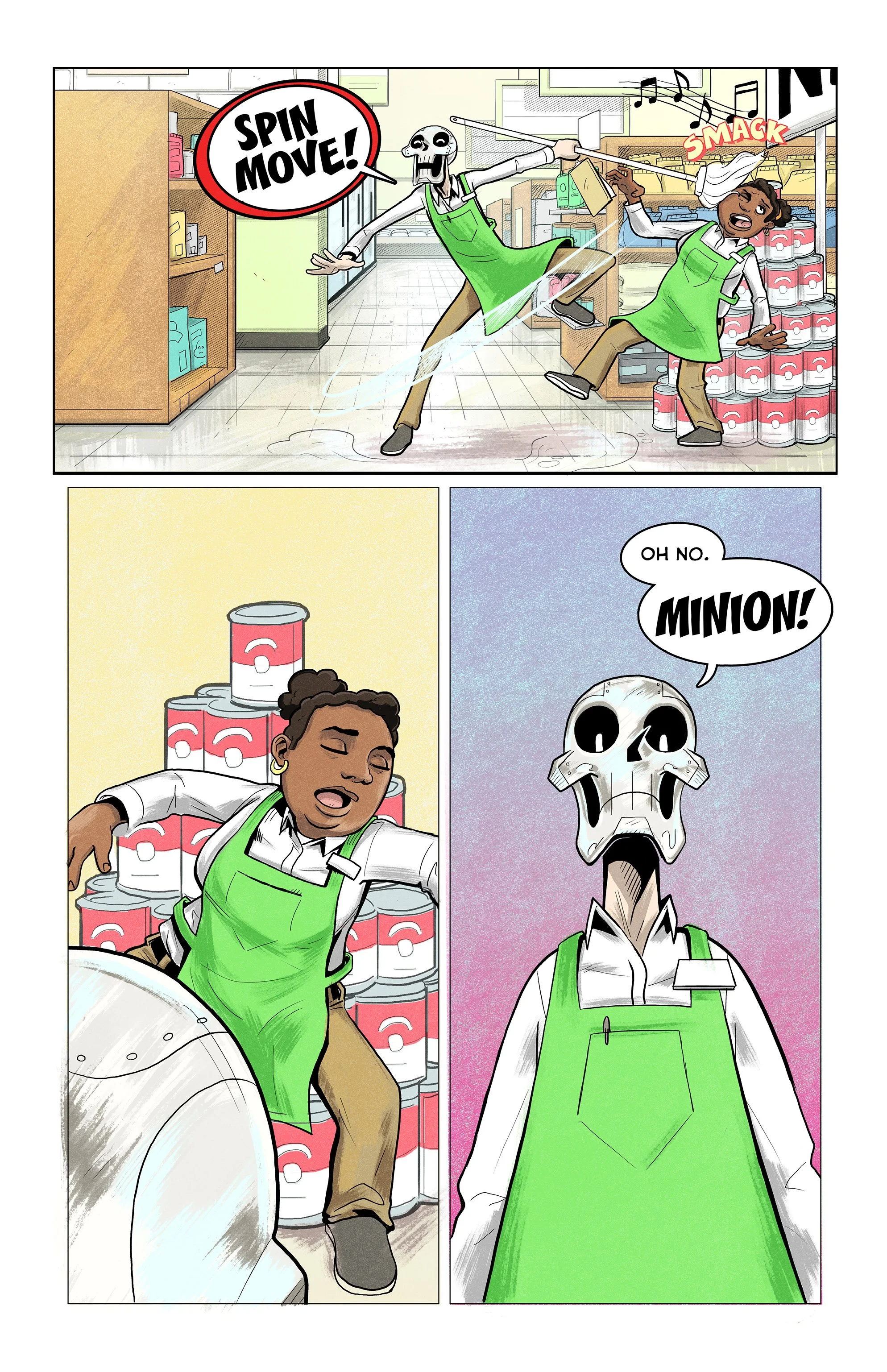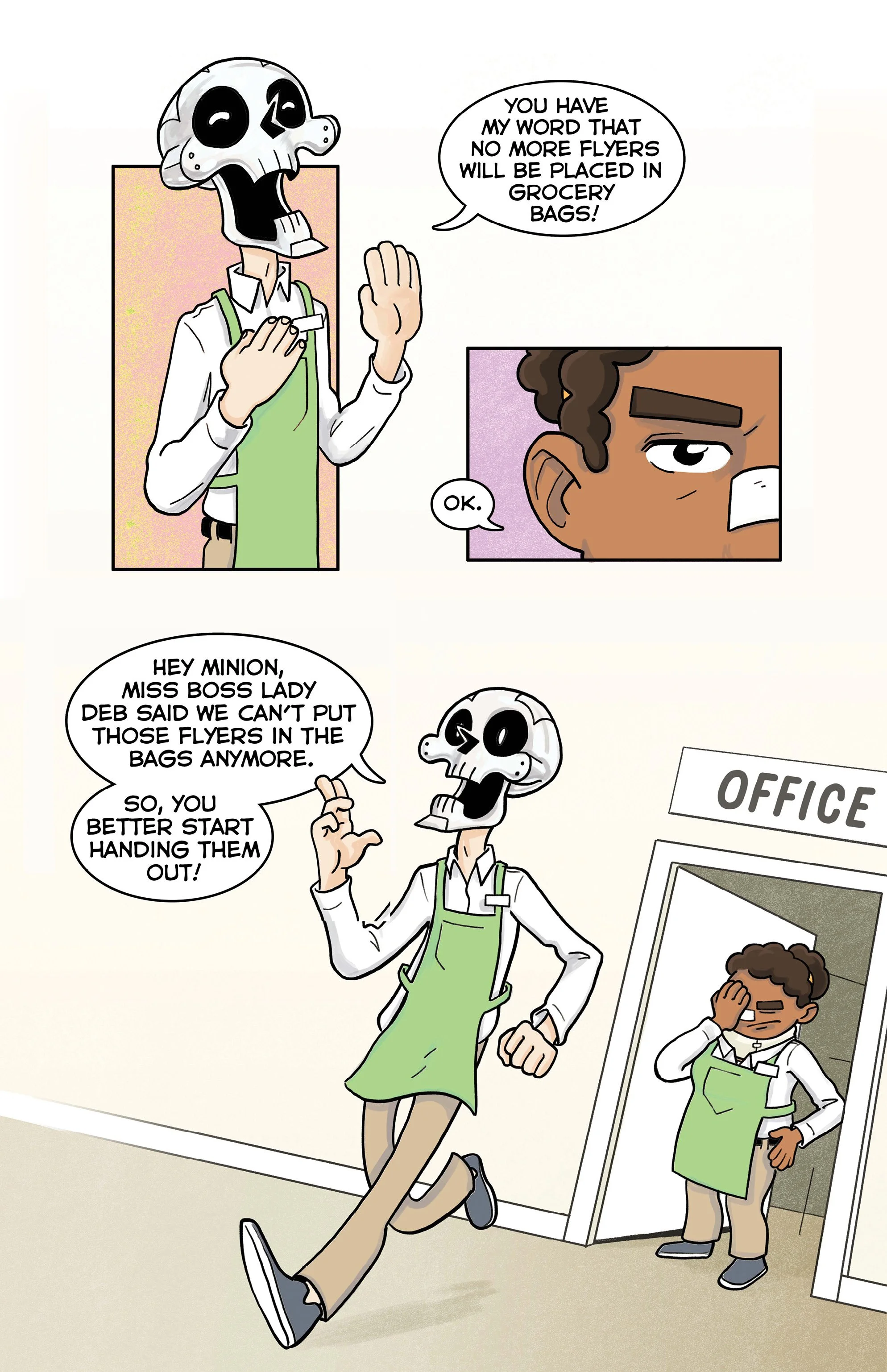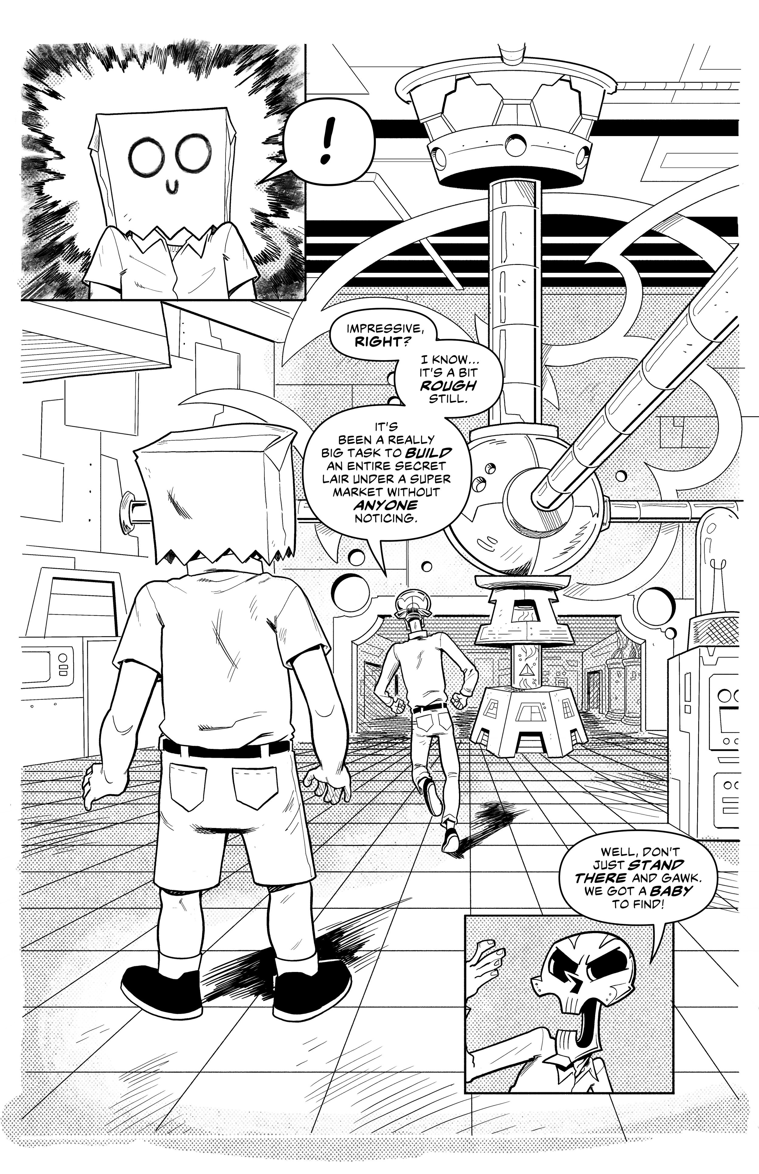 An ex-super villain named ‘Doom Skull’ begins working at the supermarket Big Mart with his minion, ‘Bag Boy’.