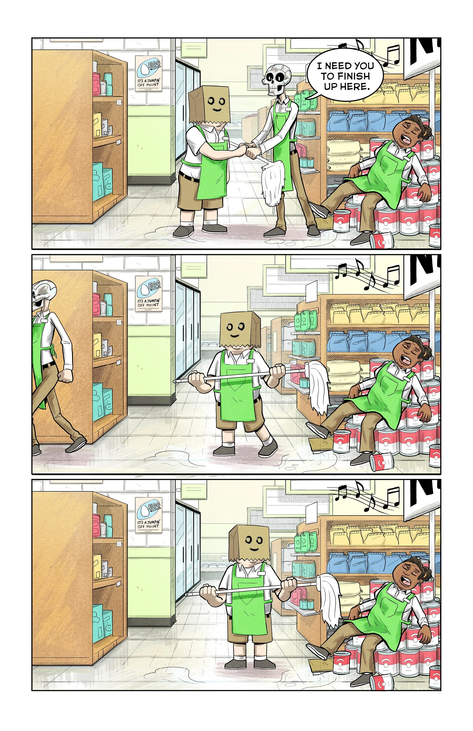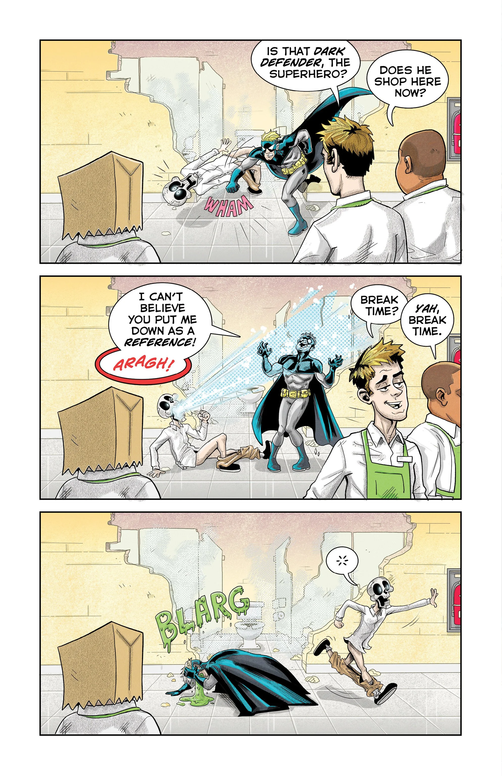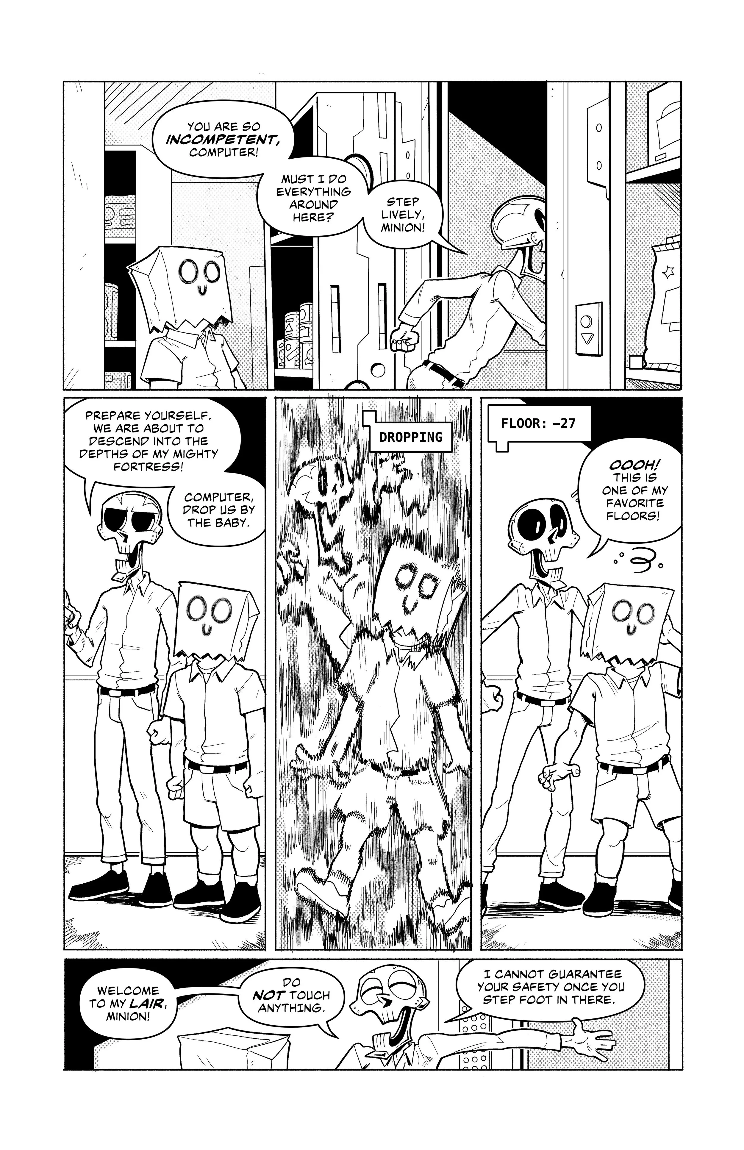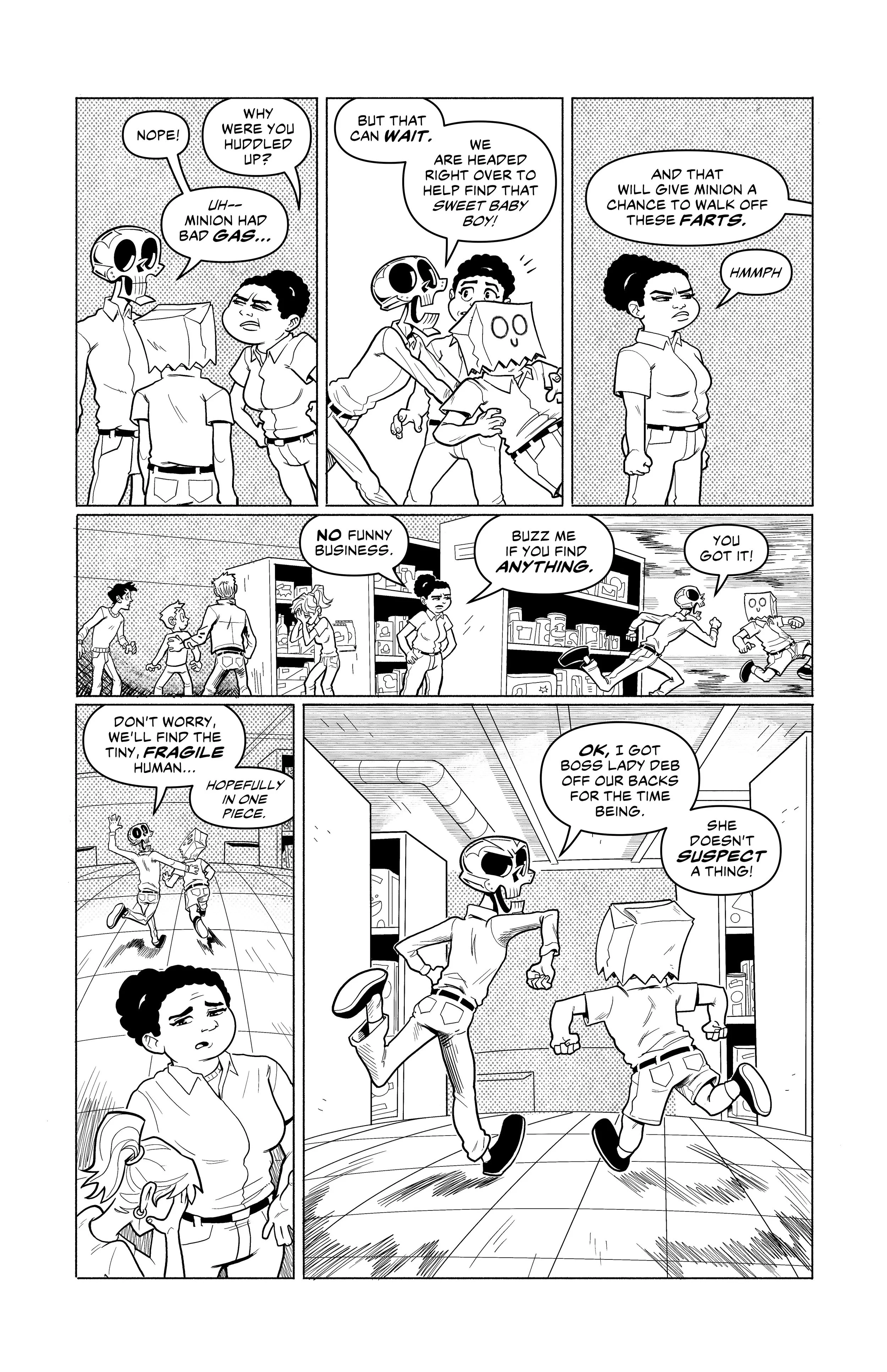 An ex-super villain named ‘Doom Skull’ begins working at the supermarket Big Mart with his minion, ‘Bag Boy’.