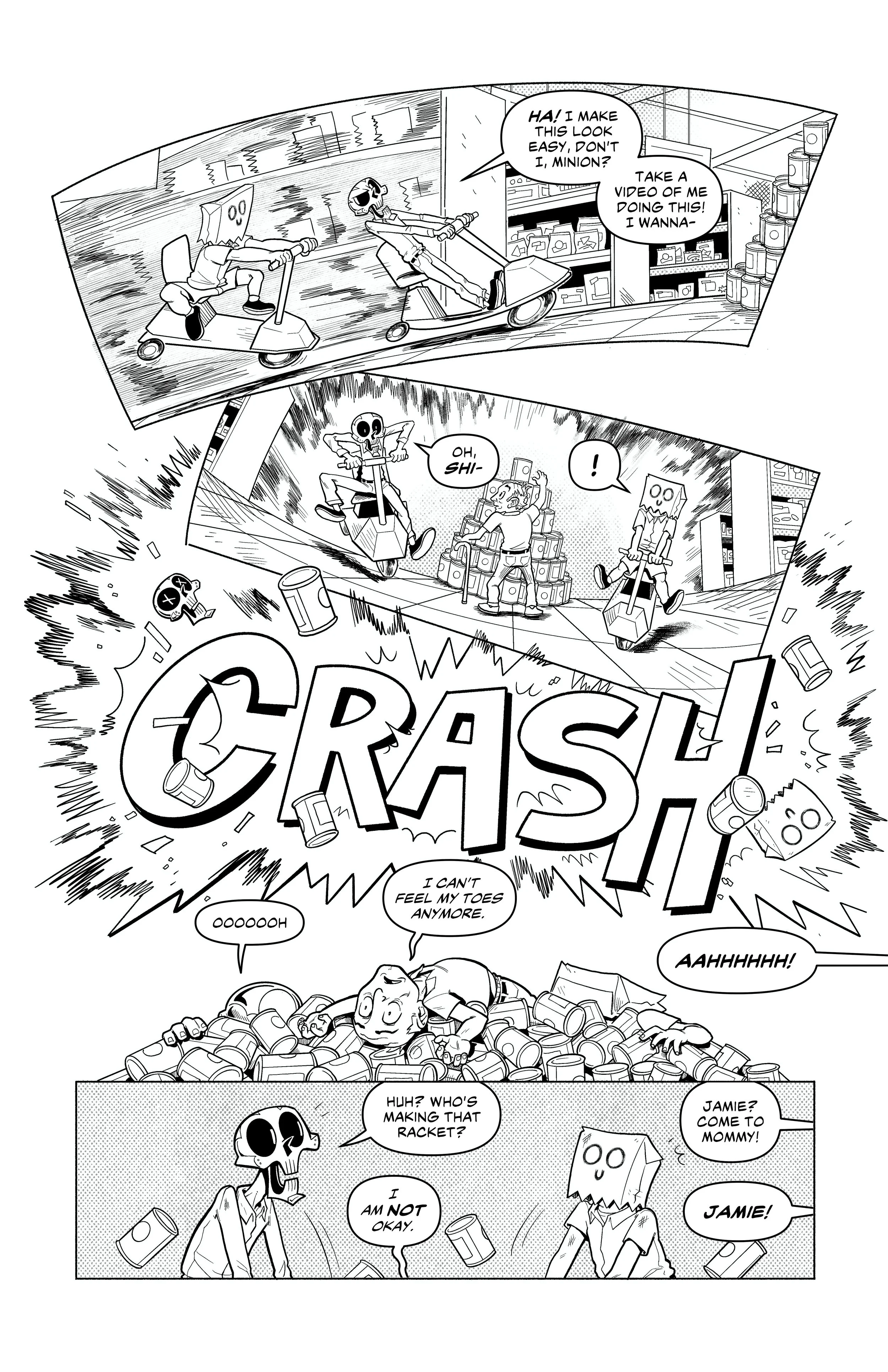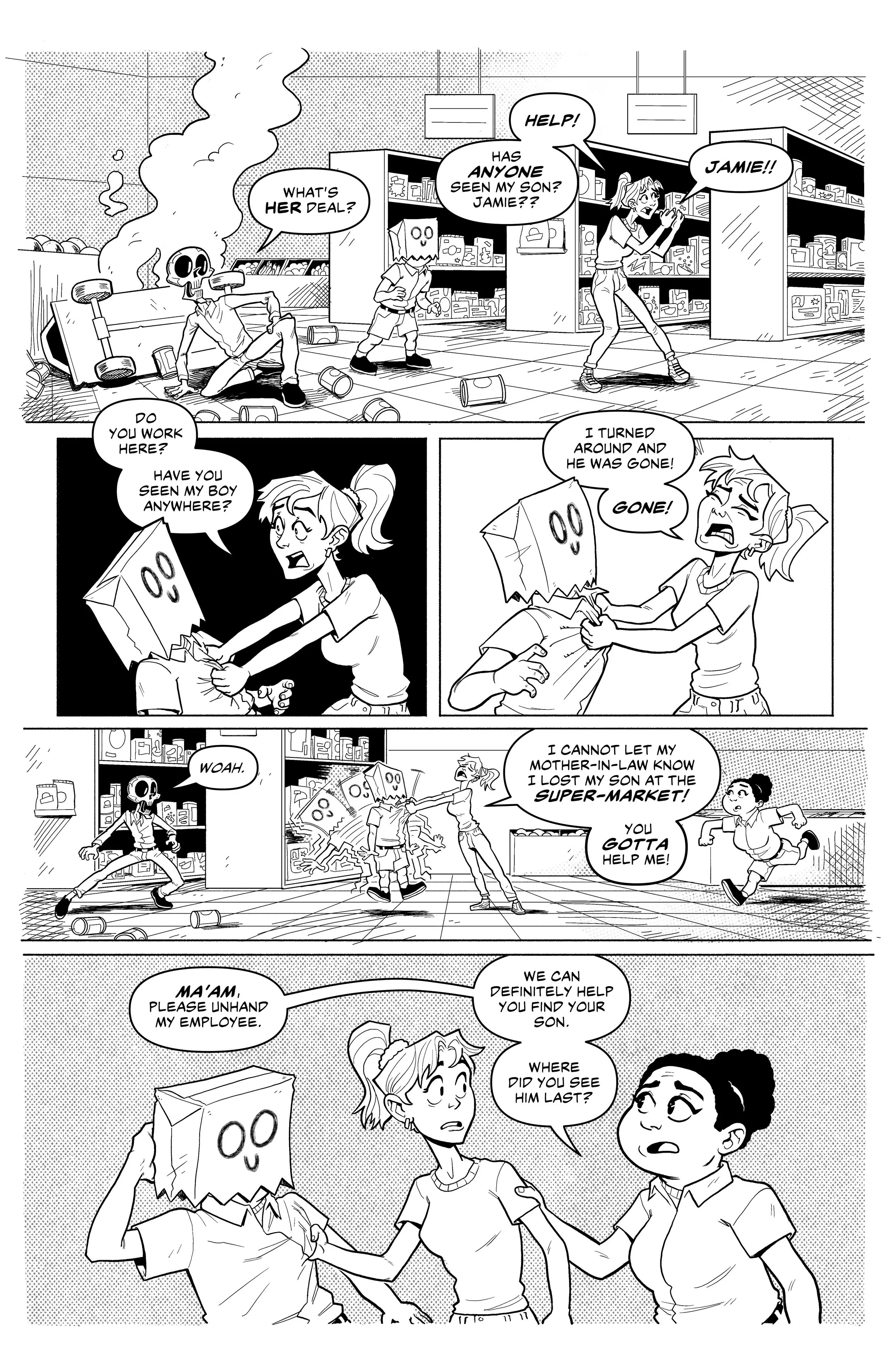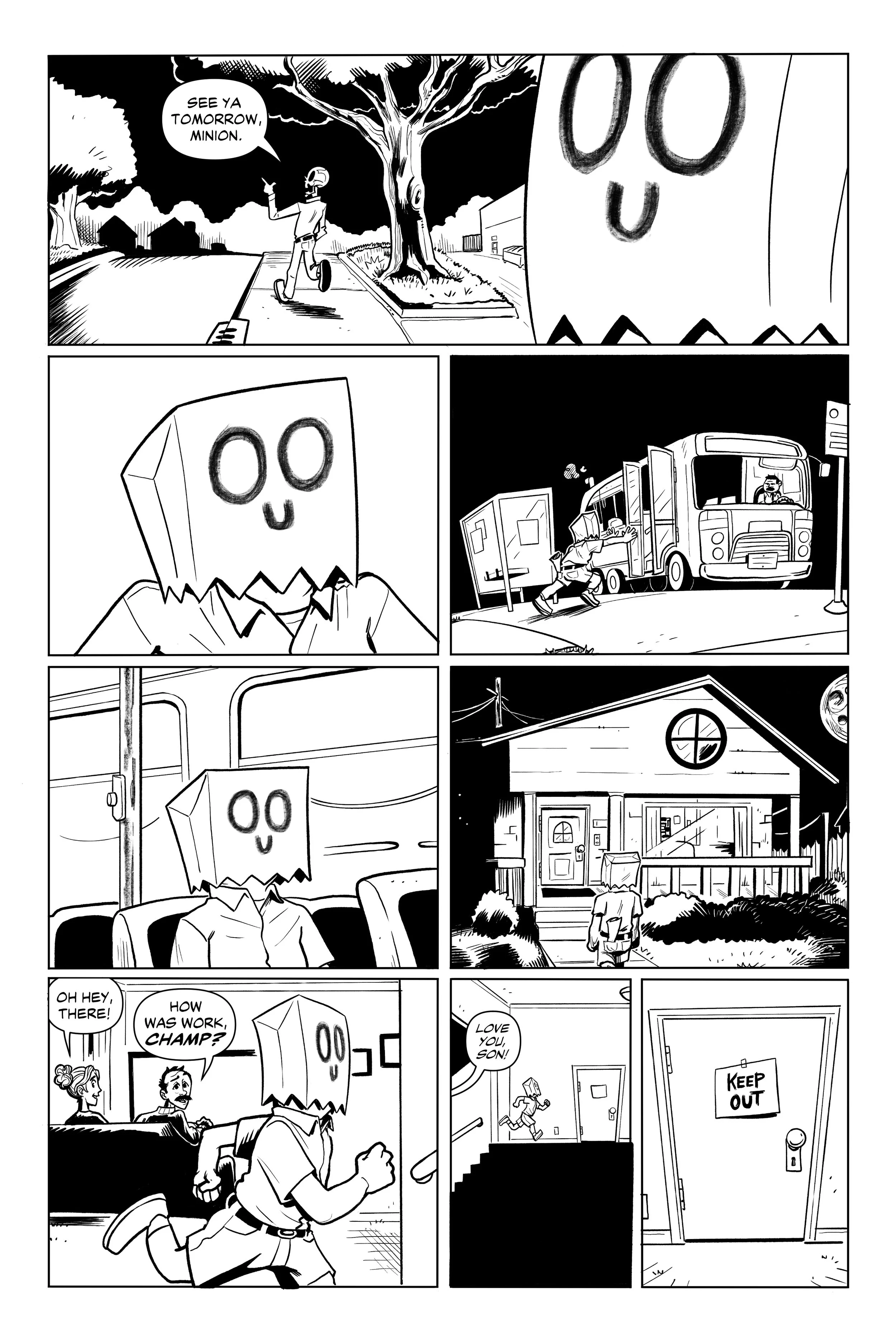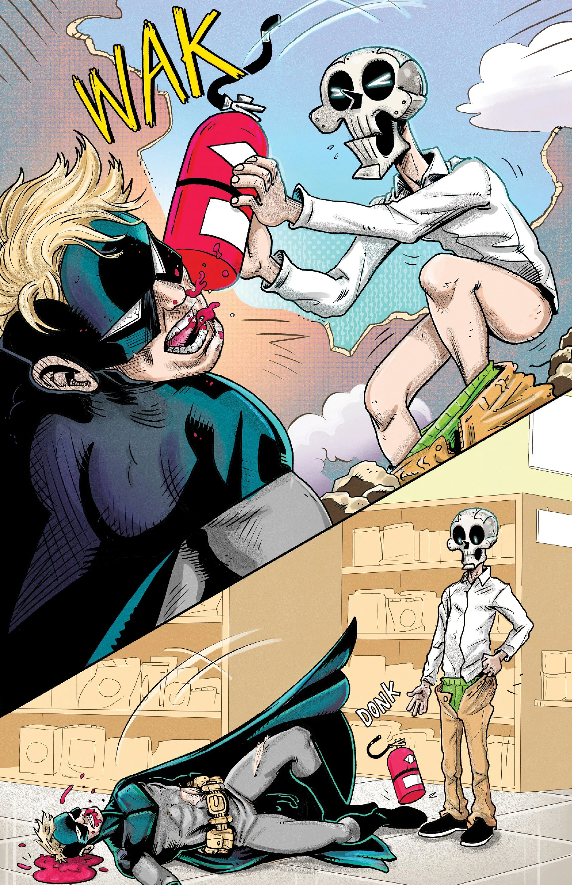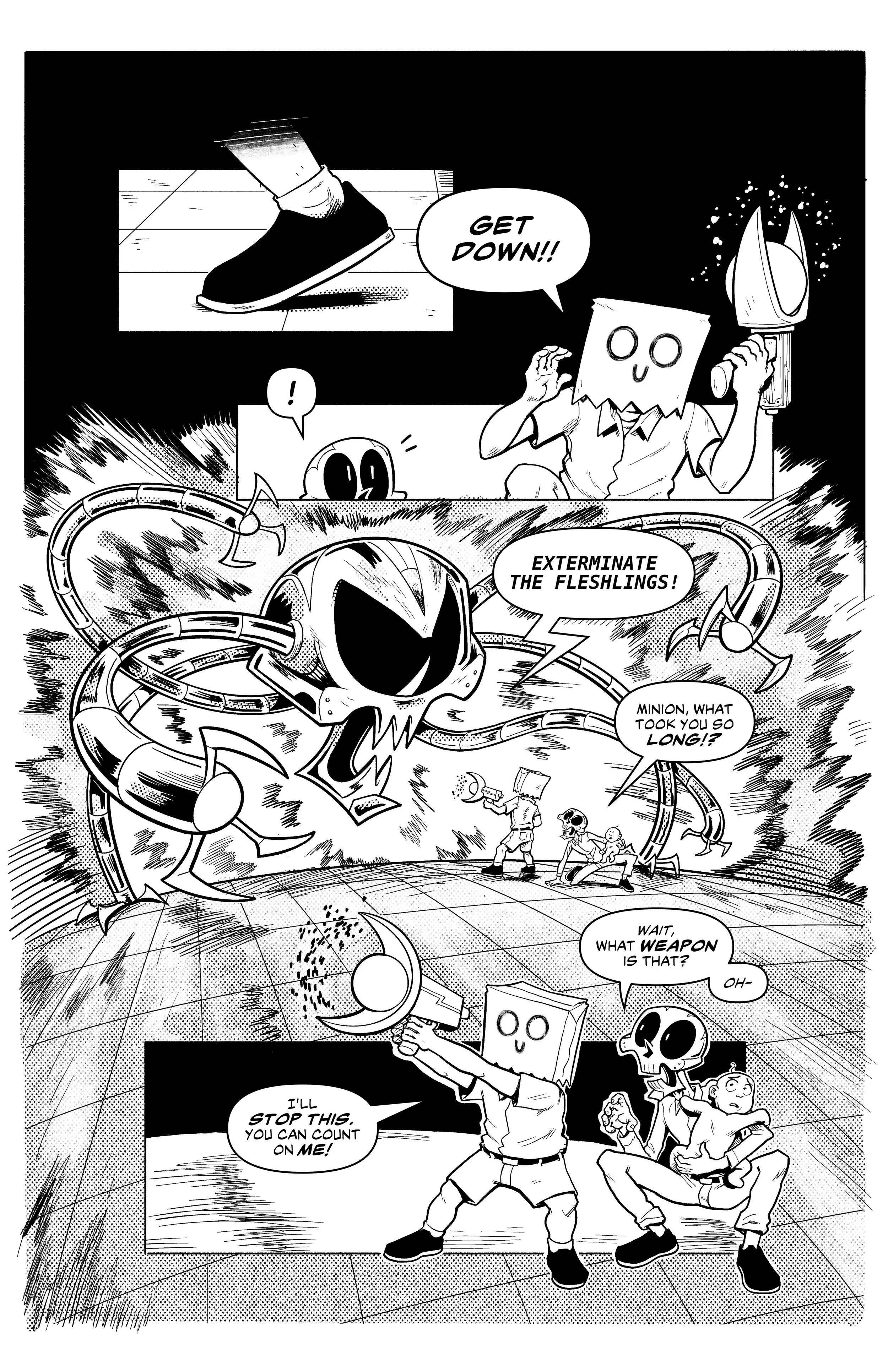 An ex-super villain named ‘Doom Skull’ begins working at the supermarket Big Mart with his minion, ‘Bag Boy’.