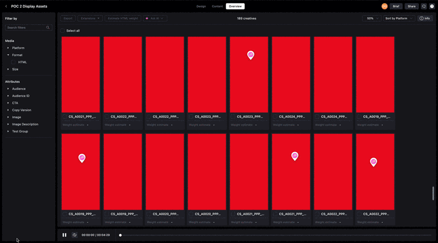 Working from a strategic framework outlined in an Excel sheet, we developed 189 unique ad variations tailored to different audiences and messaging objectives. I built a dynamic template within Celtra using the matrix function, allowing us to input headlines, images, and animations that aligned with State Farm’s brand guidelines. This process automated the production of these creative assets, ensuring quick deployment and seamless implementation in-market.